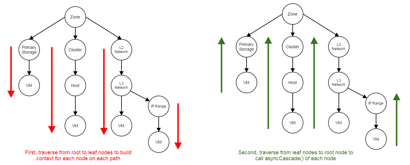 Resources in a cloud depend to each other more or less; for example, a host is a child resource of a cluster, a primary storage is a sibling resource to a cluster, and an L3 network is a descendant resource of a zone. Relationships among resources can be described as a directed graph: