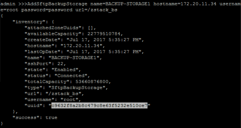 >>> AddSftpBackupStorage name=BACKUP-STORAGE1 hostname=172.20.11.34 username=root password=password url=/zstack_bs