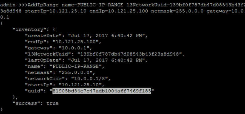>>> AddIpRange name=PUBLIC-IP-RANGE l3NetworkUuid=139bf0f787db47d08543b43f23a8d948 startIp=10.121.25.10 endIp=10.121.25.100 netmask=255.0.0.0 gateway=10.0.0.1