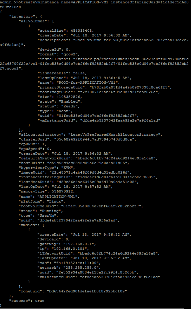 >>> CreateVmInstance name=APPLICATION-VM1 instanceOfferingUuid=f1d4dec1d6d04ca4b18344ecbbc70605 imageUuid=f2c48071c4ab46f09d8d4d31edbc026d l3NetworkUuids=bbedc6c8fb774c24a6d9244e89fe16e8